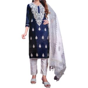 Color: Navy Blue Shape: Straight Cut Pattern: Embroidered Neck: Round Neck Sleeve Length: Three-Quarter Sleeves
