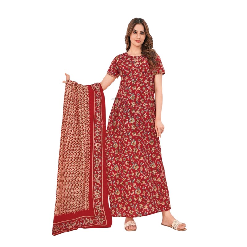 Pranjul Nighty with Duppatta – Red Floral Pattern