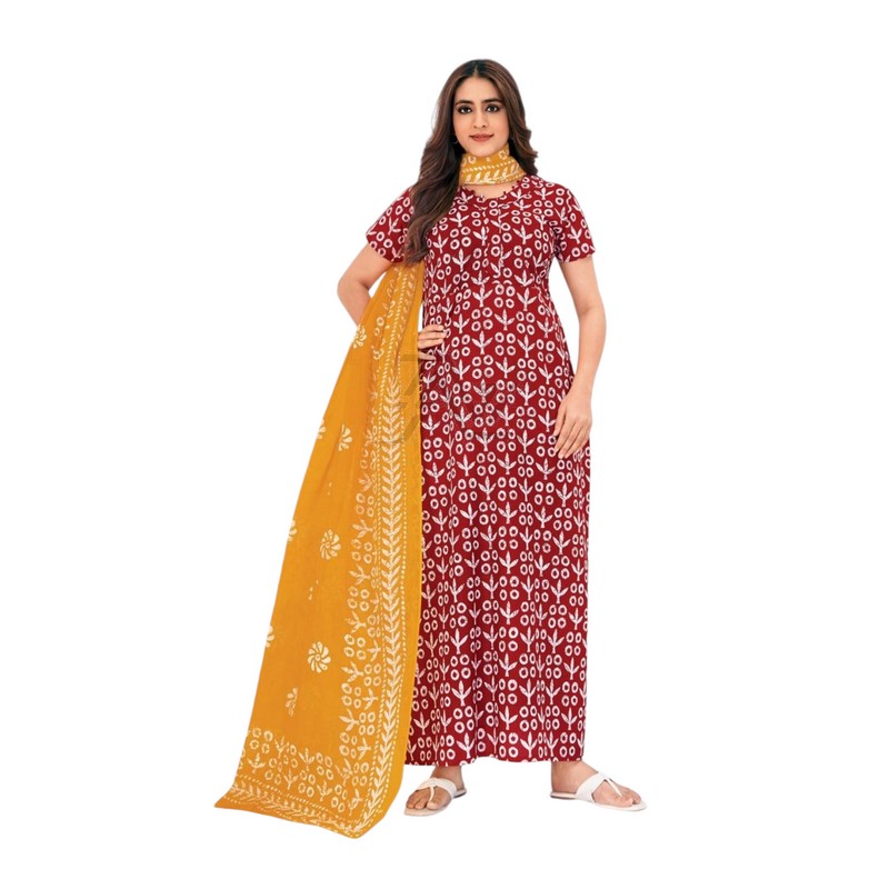 Pranjul Nighty with Duppatta – Maroon with White Circle and Leaves