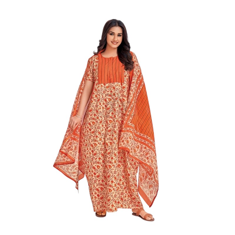 Pranjul Nighty with Duppatta – White and Orange Floral Pattern